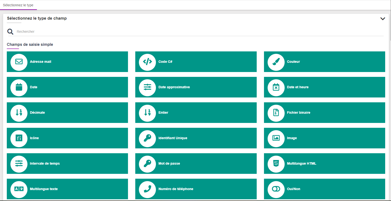 Dans cette partie, il faut choisir le type de champ. La liste peut être impressionnante au premier abord, mais elle est facile à utiliser. La zone de recherche en haut permet de trouver rapidement ce que l'on veut.