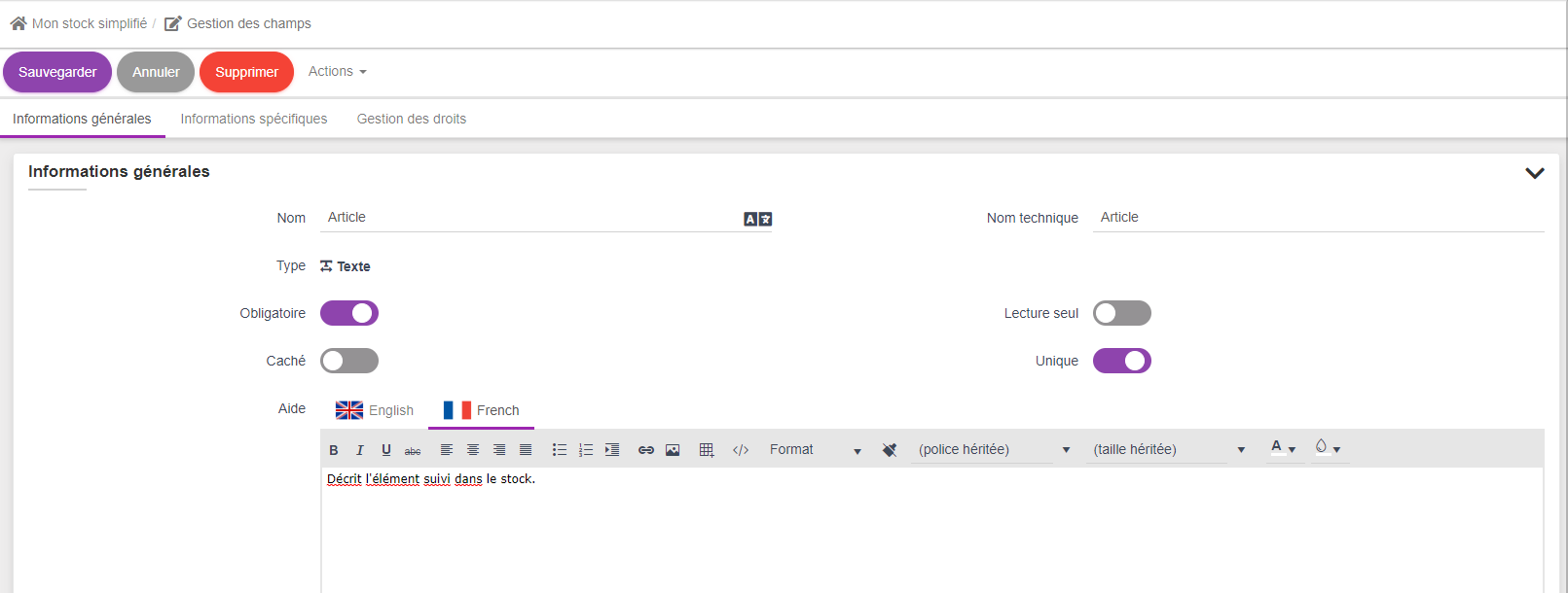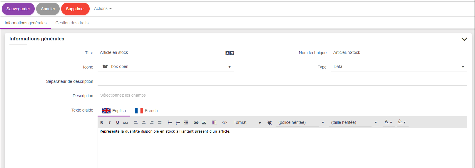 qui sera la base de l'aide disponible dans la documentation en ligne qui sera générée dans l'application. Encore une fois rien d'obligatoire, mais il c'est une bonne pratique de s'astreindre à remplir les textes d'aide le plus tôt possible car cela facilite fortemment la prise en main pour les utilisateurs. Cette aide est multilangue et la liste des langues à remplir dépend du paramétrage global linguistique de la plateforme.