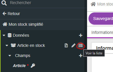 Il est possible, directement dans le DarkOffice applicatif de gérer les données de l'entité fabriquée. Pour ce faire, il faut déplier le menu de gauche pour voir l'entité "Article en stock" et de cliquer l'icone "voir la liste" à droite du nom.