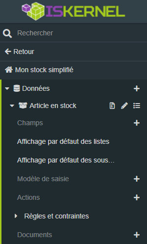En ce qui concerne la plateforme ISKernel, nous allons considérer qu'il faut créer une entité nommée "Article en stock" qui contiendra les champs de données suivants: