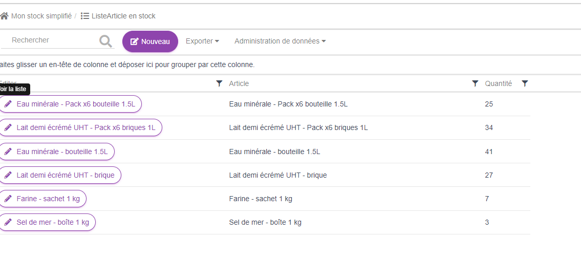 Pour le moment, le modèle est vraiement simple. Avec un peu plus d'expérience, nous pourrions mettre en place une table de référence des articles avec des règles permettant de "découper" un packe de x6 en 6 bouteilles d'eau ou 6 briques de lait, mais pour cette première approche faisons simple. De même, il est "simpliste" de mettre en place une gestion très manuelle des quantités qui demandent de mettre à jour à la main les données directement dans le tableau.