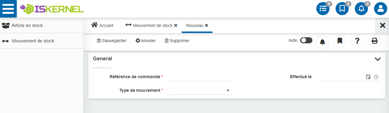 a été automatiquement mis à jour et que le formulaire "Mouvement de stock" a été créé et nous permet de renseigner notre entête de bon de mouvement.