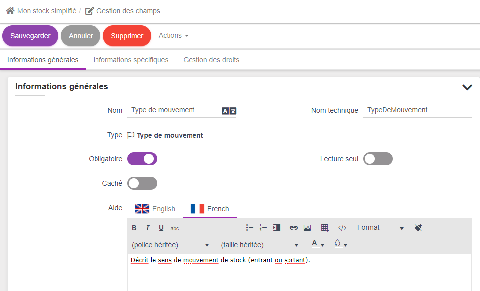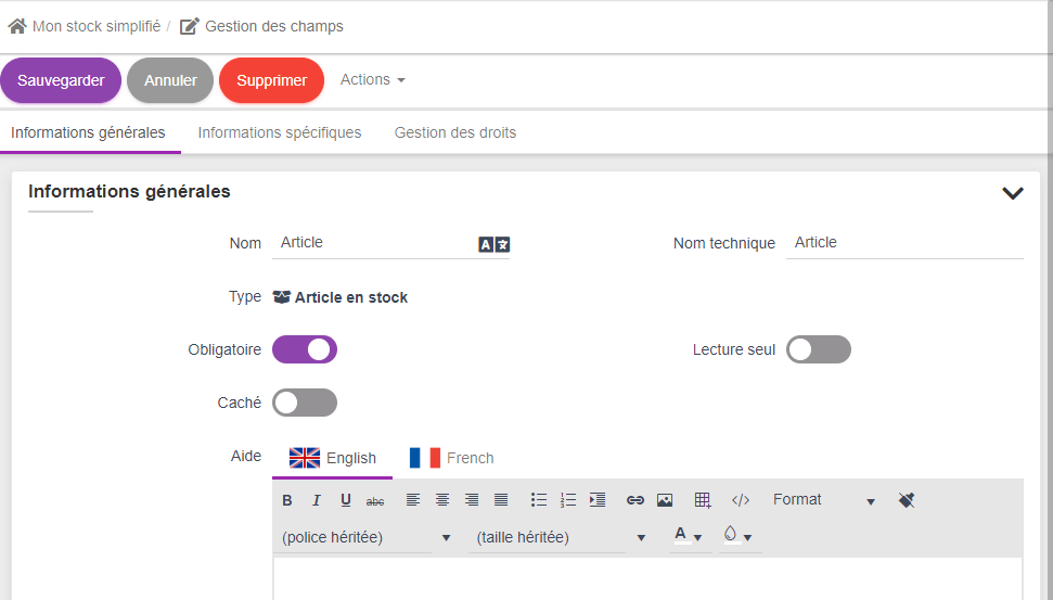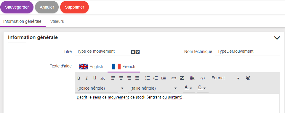 Dans la nouvelle page qui s'affiche, les noms et noms techniques sont repris automatiquement du paramétrage de l'article en stock fait précédement.