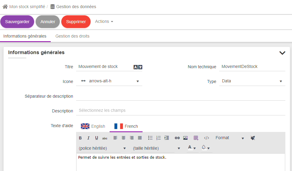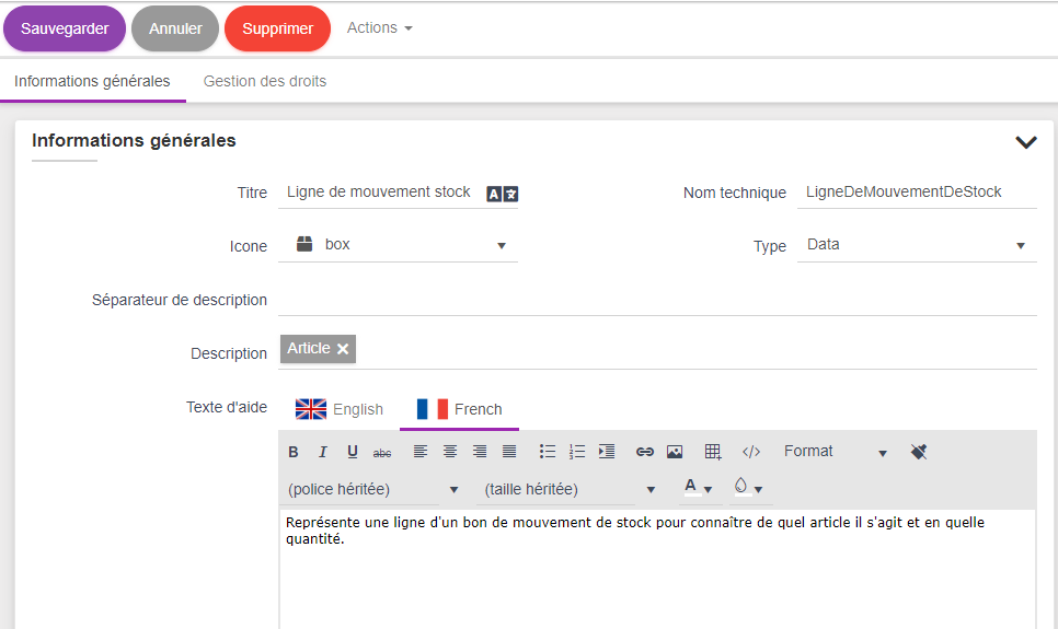qui sera la base de l'aide disponible dans la documentation en ligne qui sera générée dans l'application. Encore une fois rien d'obligatoire, mais il c'est une bonne pratique de s'astreindre à remplir les textes d'aide le plus tôt possible car cela facilite fortemment la prise en main pour les utilisateurs. Cette aide est multilangue et la liste des langues à remplir dépend du paramétrage global linguistique de la plateforme.