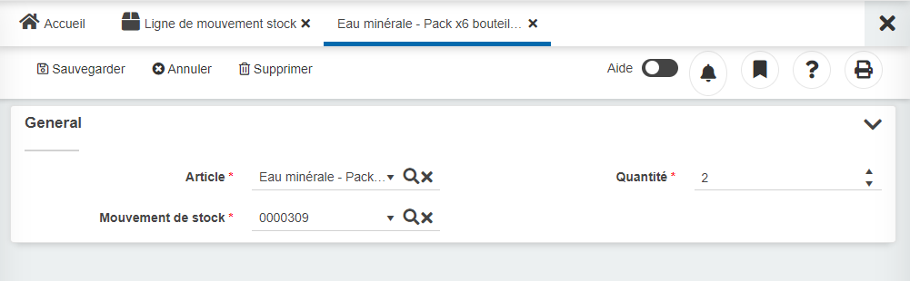 Texte d'aide: Indique la quantité concerné par le mouvement du stock pour l'article.