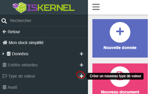 Dans la plateforme ISKernel, une liste déroulante statique (c'est à dire, dont les valeurs ne changent pas lors de l'utilisation) est appelée "Type de valeur". Pour créer cela, il faut cliquer sur le "+" à côté de l'entrée "Type de valeur" du menu de gauche