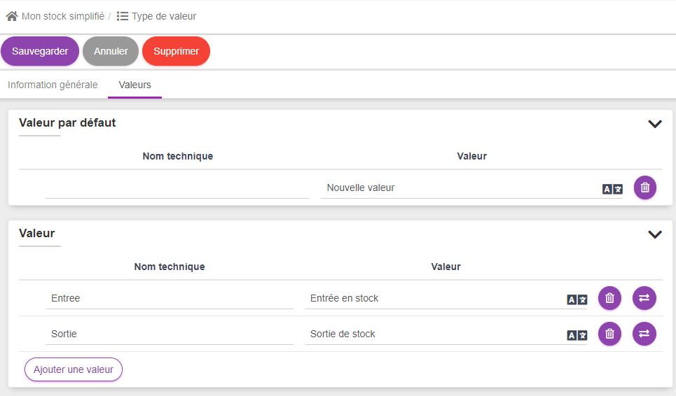 Pour saisir la notion de "Sortie de stock", cliquer sur "Ajouter une valeur" puis dans la ligne créee, entrer les données suivantes